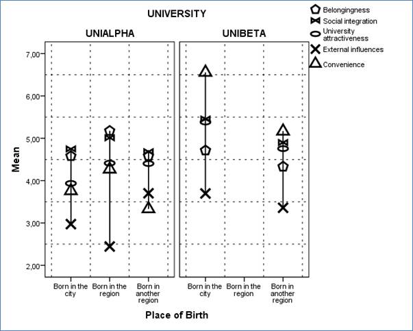 Given that the universities adopt different admission policies, possible differences in opinions regarding local and non-local students were also tested. This assessment was important for evaluating two factors which, in theory, should favor the local residents more than the non-local ones: sense of social integration, and convenience. Surprisingly, few differences were found. In UNIALPHA, a sole significant difference found was the influence of others when choosing to major in tourism was higher among students coming from out-of-area than among those born in the region (Sig=0.025). Furthermore, at UNIBETA, local students evaluated the university attractiveness and convenience more highly than those coming from outside the region (Sig=0.09 and Sig=0.00). In Figure 2, we see that at UNIALPHA, the most visible difference occurs in the external influences (the ‘X’ mark) between people born in the region and those coming from other places. At UNIBETA, conversely, the differences in convenience, social integration, and university attractiveness were visibly higher for those born in the city than for those coming from other places.