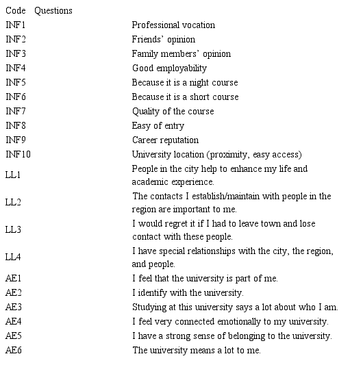 The reasons for choosing the major and the university (INF1-INF10) were based on Soares (2002), Santos (2005), Rots & Aelterman (2009), Mondini, Mondini, Borges, & Domingues (2014), De Faria, Weber, & Ton (2012). The questions concerning the social connection to the place (LL1-LL4) were adapted from Yuksel, Yuksel, & Bilim (2010), and those regarding the sense of belonging to the university (AE1-AE6) were adapted from Jang, Kim, & Lee (2015). The codes used for the variables (“INF,” “LL,” and “AE”) were derived from the instrument in Portuguese, and were kept as per the originals to facilitate the analysis.