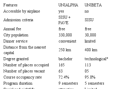 Both of the universities involved in this work are located in provincial towns, but their history and local features are quite different. UNIALPHA is a century-old university located in a hub with 330,000 inhabitants, accessible by airplane and served by a complete structure of services and entertainment. UNIBETA, on the other hand, is a multi-site university, composed of ten small campuses located in small towns far apart from each other, along the Brazil-Uruguay border, and lacking in many services and facilities.