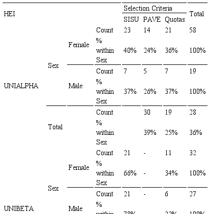 A total sample of 136 students (33.8% male and 66.2% female) were questioned by the researchers; 77 at UNIALPHA and 59 at UNIBETA. As shown at Table 3, most of the undergraduate students enrolled at UNIALPHA (61%) had been ranked by PAVE or entered by Quotas (two of the less competitive systems), and only 39% had competed for their places via SISU (the free competition system). At UNIBETA, on the other hand, only 29% of students had been admitted by Quotas, and 71% had entered by the universal system.