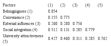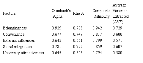 The results also confirmed that for the students, the chance to attend a higher education program in their own city, at a convenient time, was the most important driver of university attractiveness. All the factors showed acceptable indices of reliability and AVE (Table 4). Three factors showed Cronbach’s Alphas that were somewhat lower than 0.7 but were nonetheless considered reliable based on the composite reliability, a measure that provides a more appropriate measure of internal consistency (Hair et al., 2014). All the structural relationships (the inner model) were significant (p < 0.01).