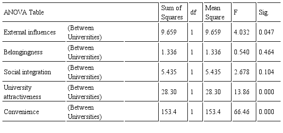 For all three factors in which significant differences were identified, UNIALPHA scored lower than UNIBETA. The mean score for convenience was 3.81 for the UNIALPHA students and 5.94 for the UNIBETA students (a difference Sig = 0.00). The external influences for students to choose tourism as a major scored 3.00 at UNIALPHA and 3.55 at UNIBETA (a difference Sig = 0.04); and the attractiveness of UNIALPHA (4.20) was almost one point lower than that of UNIBETA (5.11) (difference Sig = 0.00).