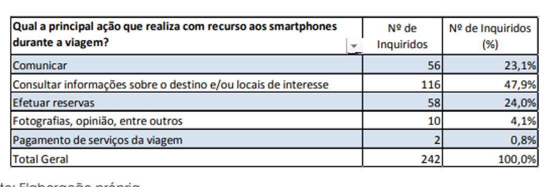 De acordo com as respostas, a principal ação realizada durante a viagem é “Consultar informações sobre o destino e/ou locais de interesse”, com 47,9%; correspondente a 116 respostas; seguindo-se “Efetuar reservas, com 23,9%, que corresponde a 58 respostas; “Comunicar”, com 23,1%, que corresponde a 56 respostas. De destacar que “Fotografias, opiniões, entre outros” não é a principal atividade que realizam com recurso à tecnologia móvel.