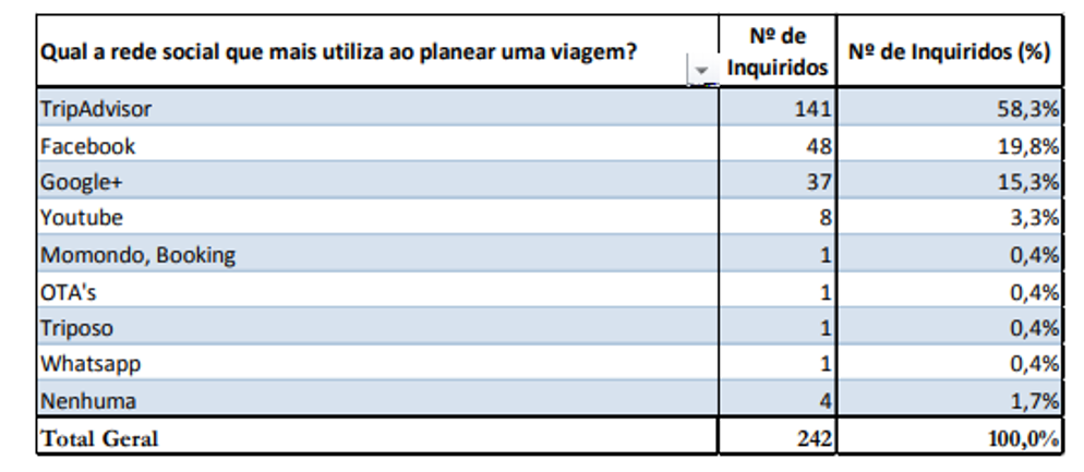 A procura de informação sobre o destino e/ou locais de interesse, tal como referido no trabalho de Gretzel (2011), é a atividade realizada mais vezes durante a viagem, sendo o TripAdvisor a rede mais consultada, o que confirma o interesse na procura de informação on-line.