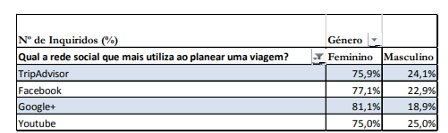 Quanto à rede social mais utilizada, destacam-se o TripAdvisor, com 58,3% (141 respostas); o Facebook, com 19,8% (48 respostas); o Google+, com 15,3% (37 respostas); e o Youtube, com 3,3% (8 respostas), em que o TripAdvisor é, inegavelmente, a maior fonte de consultas, tal como apresentado na Figura 13, e do género feminino, tal como apresentado na Figura 14.