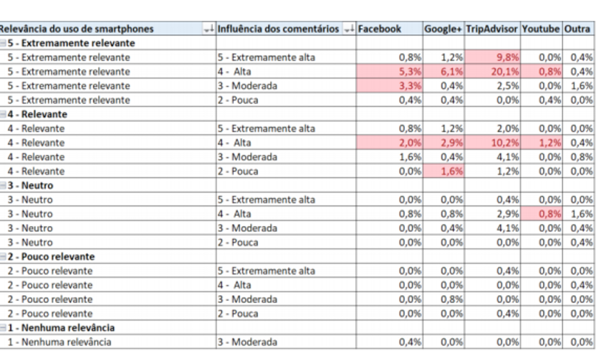 Na Figura 15, é efetuada a análise da relevância do uso de smartphones por influência dos comentários, tendo em consideração a rede social mais utilizada para planear as suas viagens, onde se destaca o TripAdvisor com as percentagens mais elevadas, para quem considera o uso de smartphone “extremamente relevante” e “relevante”. Nos inquiridos que não atribuem relevância ao uso de smartphone, ou seja, “neutro”, “pouco relevante” e “nenhuma relevância”, a influência dos comentários apresenta valores muito baixos, tal como seria de esperar.