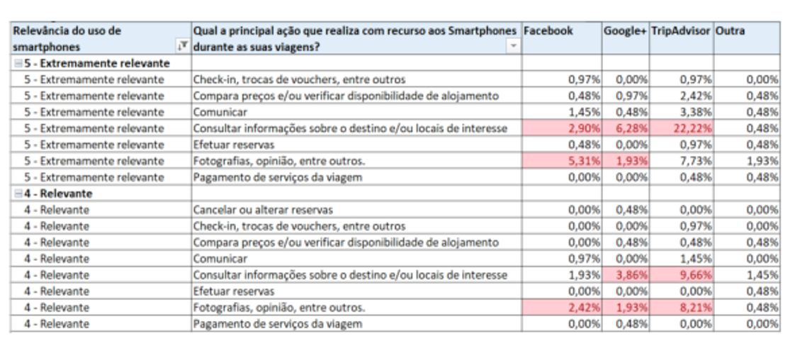 No grupo dos “relevante”, referente à importância do uso de smartphone durante a viagem, os resultados são semelhantes ao grupo anterior, em que as ações mais realizadas são a consulta de informação sobre o destino e/ou locais de interesse e por fotografias e comentários. Destaca-se ainda que, na rede social Facebook e deste grupo, a ação mais realizada é de procurar por fotografias e comentários, não sendo esta plataforma destinada à procura de informações sobre o destino.