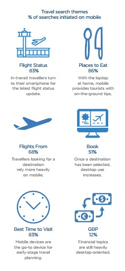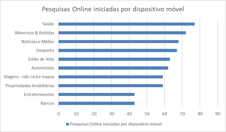 De acordo com um estudo feito pela Hitwise (2016), em 2016, com foco no mercado britânico, foi efetuada uma análise do perfil de mais de 3 milhões de consumidores e cerca de 60% das procuras foram relacionadas com o turismo por meio de dispositivos móveis (ver Figura 1 – viagens). Ainda segundo o mesmo estudo, as pesquisas iniciadas em dispositivos móveis têm o papel principal de responder às principais dúvidas dos consumidores antes da compra.