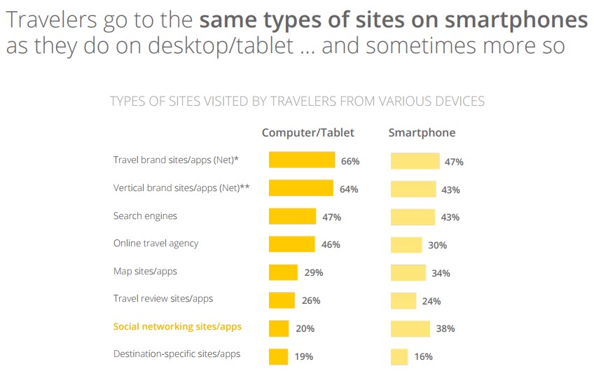 Os smartphones são ferramentas chave para os viajantes (Hitwise, 2016). A pesquisa feita pela Hitwise divulgou a percentagem de pesquisas relacionadas com o turismo, iniciadas em dispositivos móveis de acordo com o interesse ou área (ver Figura 2). A personalização dos dispositivos móveis, a flexibilidade de uso (em qualquer lugar, a qualquer hora e qualquer tipo de informação) e a disseminação (em função das ligações que permitem compartilhar informações) são as características mais relevantes da tecnologia móvel (Kim, Park, & Morrison, 2008).