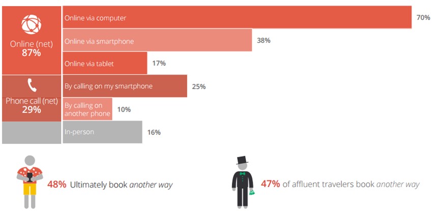 Apenas para complementar o gráfico, vale ressaltar que 47% dos viajantes escolhem outras formas de fazer a reserva e 48% dos viajantes de luxo/mais ricos escolhem outros caminhos para concretizar a reserva.