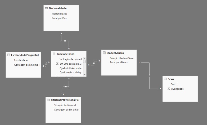 Após validação das respostas, limpeza e tratamento dos dados recolhidos, foi criado o modelo de dados para efetuar uma análise com ferramentas de business intelligence (Santos & Ramos, 2009) integradas dentro do Microsoft Excel: PowerPivot e Powerview. O modelo de dados apresentado na Figura 5 é constituído por uma tabela de factos, que contêm as medidas associadas às respostas e cinco dimensões que contribuem para caracterizar os inquiridos.