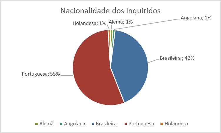 De acordo com os dados obtidos, os inquiridos são na sua maioria de nacionalidade portuguesa e brasileira, tal como apresentado na Figura 6. Dos inquiridos, 134 eram de nacionalidade portuguesa, que representam 55%; 102 brasileira, que representam 4%; e as restantes nacionalidades foram contempladas com um inquirido como resposta.