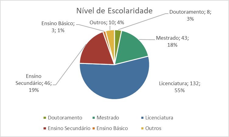 Quanto à escolaridade dos inquiridos, a maioria dos inquiridos tem o grau referente à licenciatura, correspondente a 55% (132 respostas); seguindo-se o ensino secundário, com 19 % (46 respostas); os detentores do grau de mestre, com 18% (43 repostas); doutoramento, com 3% (8 respostas); ensino básico, com 1% (3 respostas); e os restantes inquiridos são detentores de especializações e outras habilitações, tal como apresentado na Figura 7. Pode-se dizer que o grau de escolaridade entre os inquiridos é alto.