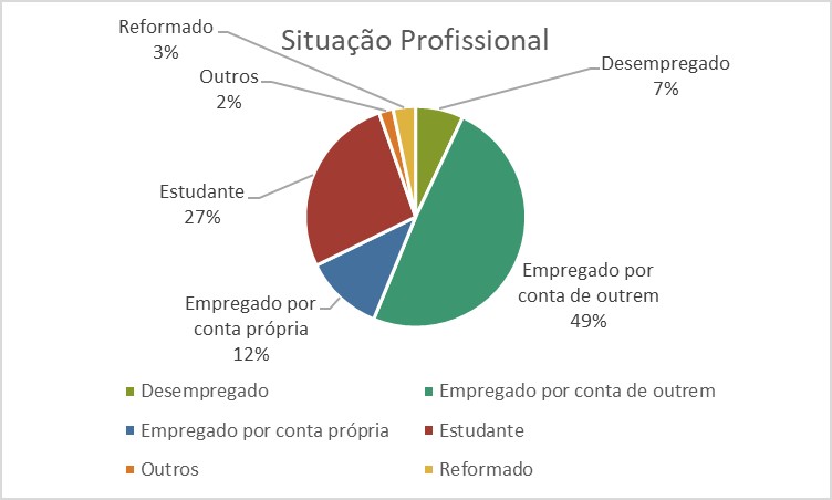 No que se refere à situação profissional, a maioria dos inquiridos é “Empregado por conta de outrem referente a 49% (119 respostas), seguindo-se os “Estudantes”, 27% (65 respostas); “Empregado por conta própria”, com 12% (28 respostas); “Desempregados”, com 7% (17 respostas); “Reformados”, com 3% (8 respostas); e os restantes inquiridos apresentam outras situações profissionais, tal como apresentado na Figura 8.