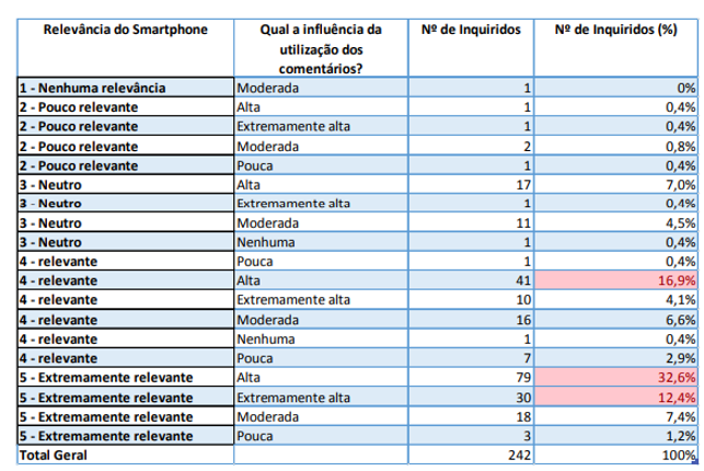 No que se refere à importância de utilização dos smartphones durante a viagem, um ponto considerado relevante foi perceber “Qual a influência da utilização dos comentários de viagem, colocados e consultados na internet, na escolha de um destino ou de uma opção de alojamento ou de visita a um ponto turístico?” Ou seja, de que forma a opinião expressa on-line por outros viajantes tem efeitos na tomada de decisão por cada um dos cibernautas.