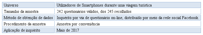 O questionário foi construído em torno de dois temas principais: a caracterização dos inquiridos e a relevância da utilização do smartphone durante as etapas de uma viagem turística. No que se refere ao segundo tema, foram definidas as seguintes perguntas de investigação: (i) Qual a relevância da utilização de smartphones durante uma viagem turística?, tendo base o trabalho de Wang et al. (2016); (ii) Qual a influência da utilização dos comentários sobre a viagem colocados e consultados na internet na escolha de um destino ou de uma opção de alojamento ou de visita a um ponto turístico?, tendo base o trabalho de Xiang, Wang, O’Leary & Fesenmaier (2015b); (iii) Qual a principal ação que realiza com recurso à tecnologia durante a viagem?, como abordado por Gretzel (2011); (iv) Qual a rede social mais utilizada? (Xiang & Gretzel, 2010).