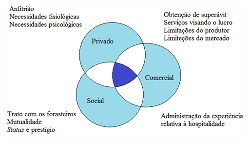 Na Figura 1, Lashley (2000) destaca os três contextos e localiza a experiência da hospitalidade na intersecção dos três aspectos.