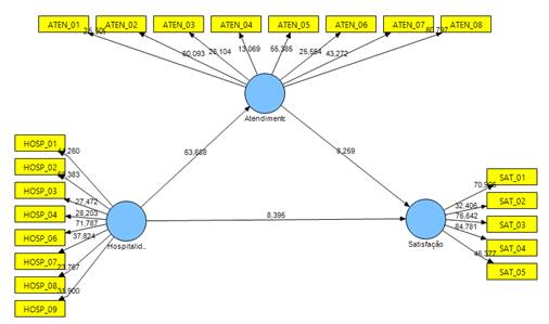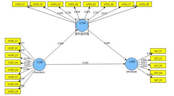 A variável Hospitalidade possui o maior coeficiente de regressão (0,430) com a variável Satisfação, ou seja, quando esta aumenta de uma unidade, a maior contribuição para ela vem da Hospitalidade. A variável Atendimento obteve um índice muito próximo, 0,428. Finalmente, a variável Hospitalidade apresentou um coeficiente de regressão de 0,864, mostrando sua influência sobre a variável Atendimento.