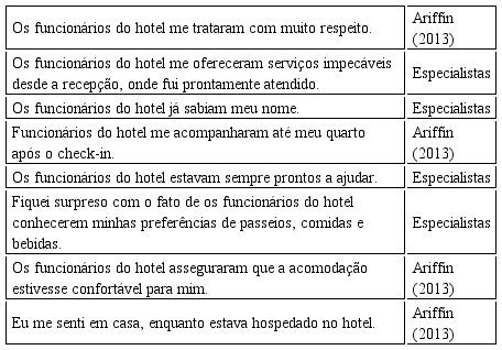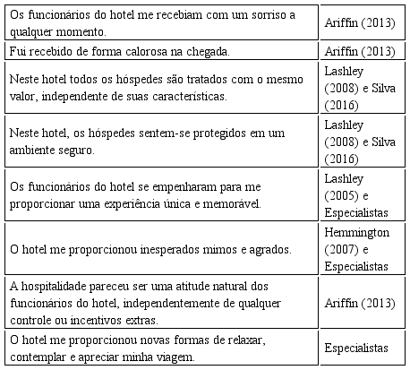 Este constructo procura captar a impressão que os usuários de hotéis de luxo têm da sua estadia à luz de variáveis que foram exploradas sob o conceito de hospitalidade. O constructo Hospitalidade foi formado por oito variáveis selecionadas da literatura, conforme mostrado no Quadro 1: