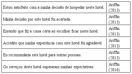 Neste construto, foram utilizadas as escalas que Ariffin (2013) usou para medir a satisfação da sua amostra que, por sua vez, foi baseada na escala de four emotion-laden items (quatro itens carregados de emoção - em tradução livre) de Westbrook e Oliver’s (1991). O primeiro item teve como base Olorunniwo, Hsu e Udo (2006). A sexta variável foi adaptada de Ariffin (2016). O objetivo, como o próprio nome do constructo indica, foi de capturar a emoção do usuário sobre sua estadia. O constructo Satisfação (dos usuários dos hotéis de luxo) foi formado por seis variáveis, conforme o Quadro 3.