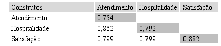 A validade convergente foi observada pelas cargas apresentadas nos modelos PLS. No modelo, as cargas λ variaram de 0,548 (λATEN_04) até 0,917 (λSAT_03). Do mesmo modo, a validade discriminante das variáveis latentes foi comprovada quando se verificou que as raízes quadradas de cada variável eram superiores à correlação entre elas e as demais variáveis latentes dos modelos, como demonstrado na Tabela 1.
