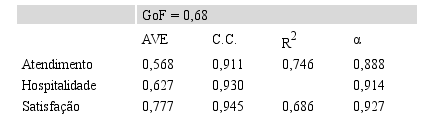 O indicador de ajuste do modelo foi satisfatório. Todas as AVEs foram superiores a 0,50, a confiabilidade composta de todas as variáveis latentes foi superior a 0,6 e os coeficientes Alpha de Cronbach foram superiores a 0,70. Além disso, o indicador de ajustamento geral (GoF) foi superior a 0,36, podendo ser considerado como adequado. A Tabela 2 apresenta os indicadores identificados por constructo.