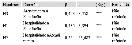 Com relação à H1 - A hospitalidade influencia a satisfação dos usuários de hotéis de luxo, ela também não foi refutada, pois os coeficientes de caminho do modelo estrutural indicam que a Hospitalidade possui uma relação positiva e significante com a Satisfação (β= 0,430, t= 8,394, p< 0,001). Quanto à H2 – A hospitalidade influencia o atendimento diferenciado nos hotéis de luxo, da mesma forma, foi demonstrado que existe uma relação positiva e significante entre a Hospitalidade e o Atendimento (β= 0,864, t= 63,687, p< 0,001), fazendo com que H3 também não fosse refutada.