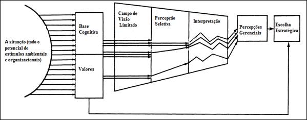 Esta capacidade limitada das equipes de gestão de absorver todos os aspectos da organização e do ambiente, no qual está inserida, resulta em um campo de visão limitado, em uma percepção seletiva e interpretações individuais da informação processada (Moon et al., 2017). Estas limitações influenciam na percepção gerencial, a qual é considerada como a necessidade de avaliar, examinar e compreender as informações para aplicá-las na escolha estratégica, como ilustrado na Figura 1 (Hambrick, 2007).