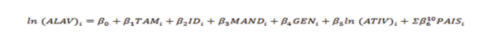 Já as variáveis independentes deste estudo foram: (i) o tamanho da equipe de gestão [TAM], medida pelo número de membros da equipe de gestão (em anos); (ii) idade [ID], medida pela média das idades dos membros da equipe (em anos); (iii) tempo no cargo [MAND], medido pela média do tempo que cada membro da equipe de gestão e (iv) gênero [GEN], medido pela porcentagem de mulheres que participam da equipe de gestão (em % de mulheres). Como variáveis de controle, foram utilizadas o tamanho da empresa [ATIV], calculado pela média do ativo nos três anos em análise, e o país de atuação [PAIS].