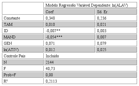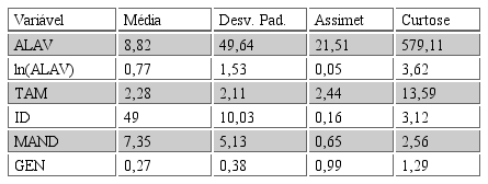 Optou-se por transformar as variáveis nível de alavancagem [ALAV] e tamanho da empresa [ATIV] por meio do logaritmo neperiano. A transformação foi necessária para aproximar a escala numérica das variáveis. Segundo Pino (2014), as transformações de variáveis podem promover a aproximação da normalidade, melhorar os níveis de significância e os intervalos dos níveis de confiança.