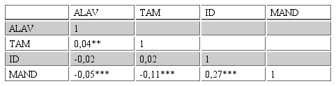 A Tabela 3 apresenta a matriz de correlações, que é elaborada para as variáveis contínuas. Observa-se que o tamanho da equipe de gestão mostra-se positivamente relacionado com o nível de alavancagem da empresa e, negativamente, com o tempo de mandato. Portanto, restaurantes com mais gestores na sua equipe de topo apresentam um maior nível de capital de terceiros (em relação ao capital próprio). Outra característica destes restaurantes é o menor tempo de permanência dos gestores no cargo.
