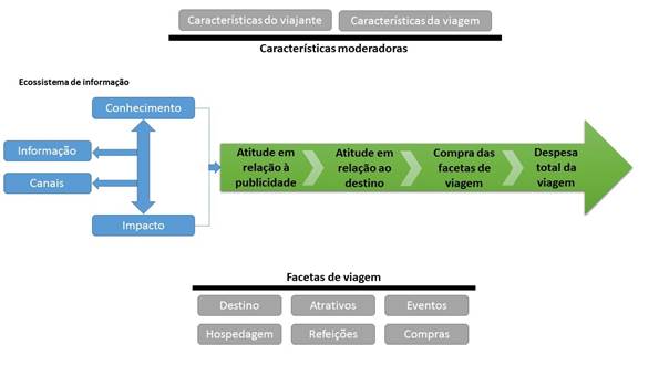 Tais facetas foram incorporadas ao modelo não apenas por pesquisas empíricas recentes realizadas pelos autores, como também por meio de teorias difundidas no que se refere ao processo de planejamento de viagens. Alguns autores, como Nicolau e Más (2006) e Choi, Lehto, Morrison e Jang (2011), identificaram, por meio de pesquisas empíricas, que as decisões de viagem normalmente seguem uma forte estrutura hierárquica, em que algumas delas (como destino, orçamento e acomodações) são realizadas anteriormente a outras, e as primeiras decisões podem influenciar as últimas. Dessa forma, Stienmetz, Maxcy e Fesenmaier (2015) as utilizam para designar as seis facetas que podem ser mensuradas a partir da percepção do visitante em relação à visualização de campanhas promocionais e, por conseguinte, no que se refere à estimativa de gastos realizados com tais itens, comportando, assim, o estágio final do modelo.