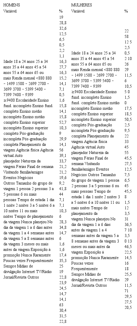 As variáveis foram divididas em duas partes, sendo a primeira constituída pelos dados sociodemográficos (faixa etária, renda mensal e escolaridade) e aqueles relacionados ao processo de planejamento de viagem (modo de planejamento, natureza da viagem, tamanho do grupo de viagem, tempo de estada, tempo de planejamento da viagem, exposição à promoção e às mídias de divulgação). Tais dados foram obtidos por meio de estatísticas descritivas, tendo a variável “gênero” sido utilizada para resultar na comparação dos dados.