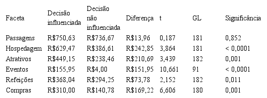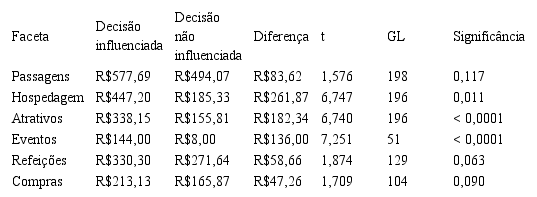 Já para o público feminino, a não eficácia foi encontrada nas facetas “Passagens”, “Refeições” e “Compras”. Mesmo com o grupo de decisão influenciada tendo gasto R$83,62 a mais em passagens, R$58,66 a mais em refeições e R$47,26 a mais em compras, os valores de significância de 0,117, 0,063 e 0,090, respectivamente, indicam que não houve eficácia para 11%, 6% e 9% dos casos nas referidas facetas (ver Tabela 3).