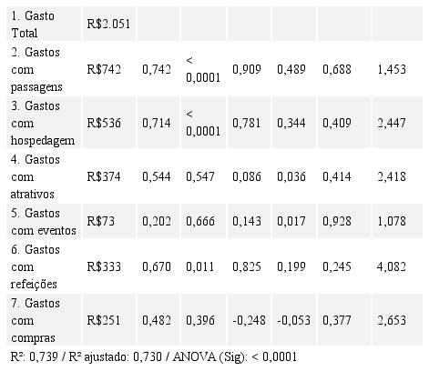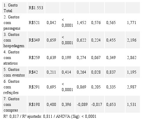 Os valores expostos na significância indicam que as facetas “Passagens”, “Hospedagem” e “Refeições” explicam diretamente o valor dispendido no gasto total (α<0,05), e o beta padronizado indica que os gastos com passagens foram os mais representativos, seguidos dos gastos com hospedagem.