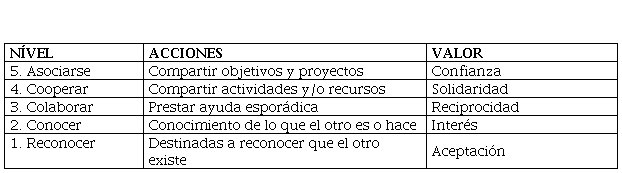 O primeiro nível expressa a aceitação que o outro existe, compartilhando o mesmo espaço. O conhecimento é quando o outro é visto como um par, despertando o interesse de conhecê-lo, um interlocutor válido, que também tem direito à palavra. O terceiro nível expressa um interesse de colaboração, no sentido de trabalhar com esse par, que não seja uma ajuda sistemática, e sim espontânea. Em nível de cooperação supõe um processo mais complexo, portanto mais sistêmico, em que existe um problema em comum, pois há a necessidade de compartilhar para resolvê-lo. No último nível, de associação, exige uma forma mais profunda de contato, compartilhando recursos físicos, financeiros e humanos. Há, nesse sentido, uma confiança. É nesse estágio que menores tenderão a ter suas divergências.