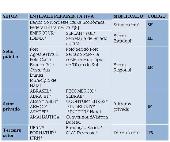 Percebe-se, assim, no que tange à divisão de setores e entidades, que é ignorada a essência de cada setor representado, fazendo-o considerar, apenas, a lógica mercadológica/economicista do turismo, o que faz com que uma universidade, um ente público que pode ser federal ou estadual - seja classificado como membro do terceiro setor; e uma associação que, em sua essência, é representante do terceiro setor, seja classificada como representante da iniciativa privada. Parte-se do entendimento de que uma associação, como a ABIH, que representa a classe dos empresariados hoteleiros, tem o poder efetivo financeiro de angariar as ações da atividade turística e, por isso, é classificada como membro da iniciativa privada. Pelos motivos opostos, a universidade é classificada como membro do terceiro setor.