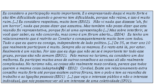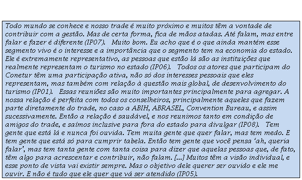 Evidenciando esta discussão, na ata da reunião um representante do setor público afirma que “no momento a melhor política do conselho é de aprovar os projetos que estão sendo solicitados neste período, ressaltando que o ministro [do turismo] afirmou que há o compromisso de até junho serem feitas a liberação das emendas individuais” (EE). Com isso, observa-se que há uma limitação no processo participativo e democrático das ações, a partir de uma postura autoritária, o que coaduna com o discurso dos entrevistados em não concordar com a interferência dos participantes e também na limitação da quantidade de atores deste processo. Consequentemente, os resultados alcançados neste tipo de representação não deflagram nenhuma relação mais conflituosa, conforme evidenciado na leitura das entrevistas, por não compartilharem maiores interesses em busca de uma construção coletiva.