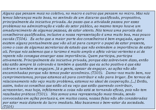 Os representantes do terceiro setor têm uma percepção do papel que devem representar, buscando engajar e manter relações e ações mais efetivas, sendo evidenciada nas entrevistas, nas atas documentais e na observação não participante. Tais evidências estão em consonância com a ideologia de divisão das entidades dentro do Conetur, reservando a esse setor representações que buscam a harmonia da atividade, seja com pesquisa (universidade e institutos) ou com ações mais práticas sociais (associações, ONG´s) (verificar Quadro 02 na metodologia).