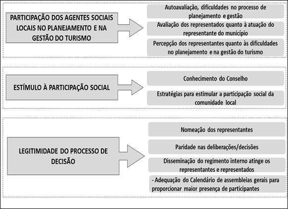 Os elementos de análise de governança que tangenciam diretamente a participação social foram considerados como categorias de análise definidas a priori, com base na abordagem de Barbosa et al. (2009) e Nobrega (2012). Assim, três categorias caracterizadas por macrovariáveis foram previamente definidas: (1) Participação dos agentes sociais locais no planejamento e na gestão do turismo; (2) Estímulo à participação social; (3) Legitimidade do processo de decisão. A partir destas categorias (macrovariáveis), foram verificados nove elementos de análise (Figura 1).