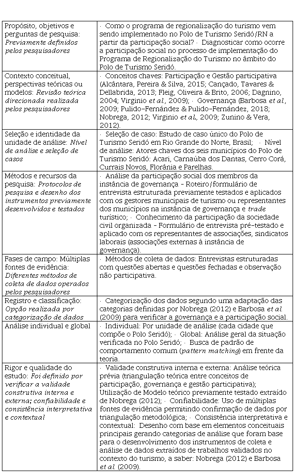 Quando se leva ao setor turístico, a governança tem sido aplicada para a eficiente gestão de destinos, porém necessita da coordenação, da colaboração, da participação e da cooperação de diferentes intervenientes em prol de objetivos compartilhados (de Sousa Santos & da Silva Pereira, 2018; Pulido-Fernández & Pulido-Fernández, 2018). Para atender aos objetivos desta pesquisa, foi aplicada uma metodologia quali-quantitativa para avaliar a participação social, sendo um estudo de caso único que utilizou entrevistas estruturadas contendo questões abertas e fechadas com atores chaves dos seis municípios do Polo de Turismo Seridó, a saber: Acari, Carnaúba dos Dantas, Cerro Corá, Currais Novos, Florânia e Parelhas. O protocolo de pesquisa seguiu o desenho de estudo de caso indicado por Larrinaga e Rodríguez (2010) e, para tanto, predefiniu categorias de análise, as quais foram baseadas nos modelos de mensuração de governança elaborados por Nóbrega (2012) e Barbosa et al. (2009).