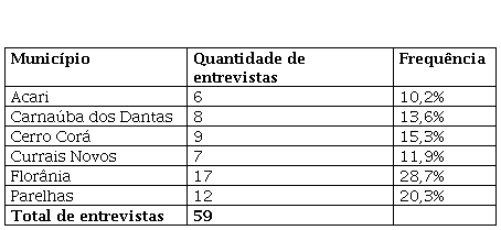 As entrevistas tiveram duração média de 30 minutos e ocorreram tanto em visitas ao local de trabalho dos conselheiros, como em dias de reuniões ordinárias ou extraordinárias das instituições que compõem o Conselho de Turismo do Polo Seridó, objetivando entrevistar um maior número de agentes sociais. Normalmente, as reuniões do Conselho ocorrem uma vez a cada mês e, em sua maioria, no município de Currais Novos. Antecipadamente é enviada a pauta do dia pelo secretário executivo do Serviço Brasileiro de Apoio à Pequena e Média Empresa (SEBRAE), que também é responsável por secretariar a reunião, lavrando uma ata. Um total de 59 sujeitos de pesquisa distribuídos nas seis cidades do polo participaram do estudo (Quadro 2).