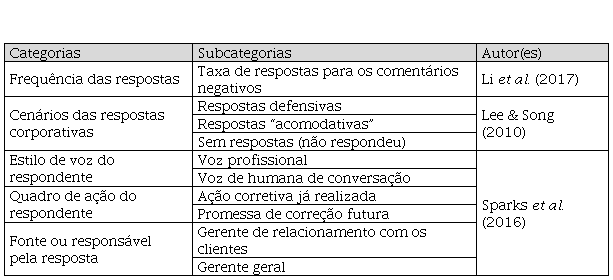 Para a investigação e a interpretação dos dados foi adotada a técnica de análise de conteúdo por temas (Dellagnelo & Da Silva, 2005), sendo o processo de codificação e categorização feito sem o auxílio de softwares. Para a escolha das categorias previamente definidas foram utilizadas as pesquisas realizadas por Lee e Song (2010), Sparks et al. (2016) e Li et al. (2017) como referências. As categorias e as respectivas subcategorias definidas por estes autores, e mantidas nesta pesquisa, podem ser visualizadas no Quadro 1.