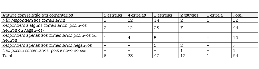Com relação à atitude de resposta das empresas, verificou-se que quarenta e quatro delas responderam a alguns comentários (positivos, neutros ou negativos), enquanto trinta e duas optaram por nunca responder às avaliações. Dez meios de hospedagem responderam apenas aos comentários positivos ou neutros, sendo que dois fizeram isso por ainda não terem recebido nenhuma avaliação negativa até o momento. E sete empresas limitaram-se a responder apenas às avaliações negativas. Um hotel de duas estrelas ainda não possui comentários, pois ingressou no site recentemente (Tabela 1).