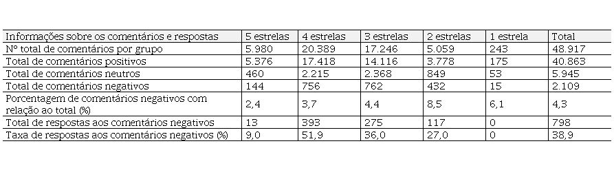 A coleta das respostas aos comentários negativos dos dados sobre o total de respostas por tipos de comentários (positivos, neutros ou negativos), bem como a verificação da atitude dos empreendimentos com relação à gestão de respostas de maneira geral (Tabelas 1 e 2), deu-se a partir da seleção das avaliações por classificação separadamente (fantástico, bom, ok, ruim e muito ruim). Em seguida, era realizada a conferência de todas as publicações registradas e respectivas respostas, em cada uma das listas geradas após a seleção dos filtros mencionados.