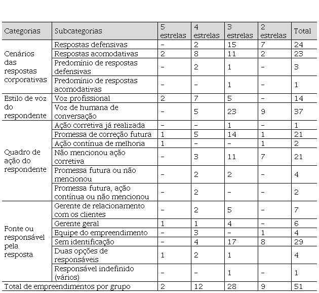 Como ressaltado ao longo da análise dos dados, a estratégia de não responder pode gerar custos de oportunidade, quando a empresa perde a chance de reverter situações negativas relatadas, de se autoaperfeiçoar com base nas críticas e nos apontamentos feitos e, principalmente, de projetar uma reputação mais positiva junto aos seus consumidores atuais e futuros. E esta atitude foi adotada por um número significativo de empresas com classificação entre 4 e 5 estrelas. Dentre os hotéis de 5 estrelas, 50% optam por não responder; e dentre os de 4 estrelas, 42,8% seguiram esta estratégia. Este resultado divergiu do que foi verificado na pesquisa de Lee e Blum (2015), já que estes autores verificaram uma conduta de respostas mais incidente nos grupos de empresas com classificações entre 4 e 5 estrelas.