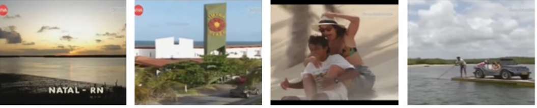 d) Variedade da flora: na telenovela Chiquitas, os personagens também passeiam pelo Cajueiro de Pirangi (município de Parnamirim). Na cena o guia de turismo fala sobre o atrativo e os personagens apreciam a vista do mirante. Em outra tomada, eles visitam ainda a Árvore do Amor e se impressionam pelo formato da planta – isso denota tentativa de criar o imaginário de destino com vegetação tropical e de certo exuberante com mata de restinga em alguns momentos, e Mata Atlântica de transição em outros. Percebe-se pouca associação do estado a um bioma bastante presente na região, a caatinga – apenas na novela Velho Chico, nos cenários de plantação de algodão – mas que a trama se passa no interior da Bahia.