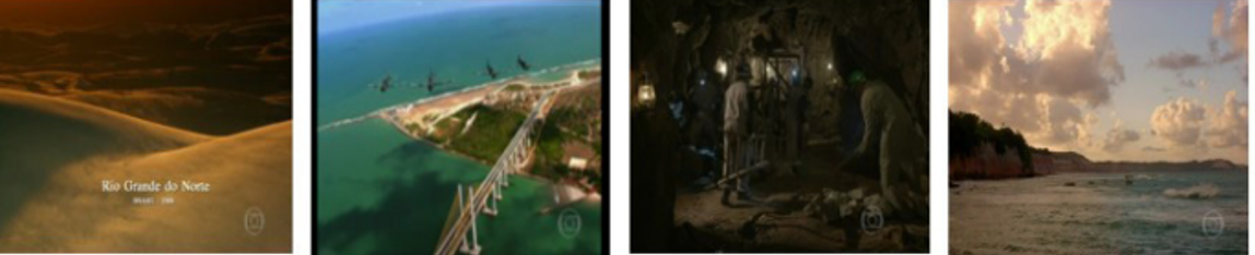 e) Lugares de interesse histórico cultural(Imagem 11): em Cambalacho foi exibida a Igreja de Nossa Senhora dos Navegantes, conhecida popularmente como Igreja de Pedra, mostrando a parte exterior da edificação, num momento de passeio pela Praia da Redinha (Natal-RN). A Fortaleza dos Reis Magos surge em cenas panorâmicas, e apenas na telenovela Chiquititas é possível visualizar a sua parte interna. Na oportunidade, o personagem da telenovela ainda conta um pouco sobre a história do local. Observa-se também a Base Aérea de Parnamirim, que aparece constantemente na telenovela Flor do Caribe, já que os personagens são pilotos. Além disso, destaca-se a Mina Brejuí, que é um atrativo histórico importante do Seridó Potiguar, mas que na tela não foi apresentado como tal. Em geral são poucos os atrativos históricos e culturais explorados, principalmente os presentes no centro histórico de Natal (os personagens normalmente se concentram no litoral). Mas é importante ressaltar positivamente certa descentralização espacial e de períodos históricos, visto que se ressaltou, mesmo que indiretamente, uma região distante da capital (mina do município de Currais Novos), além de fatos da fundação da cidade de Natal, da sua participação na 2a Guerra Mundial e a expressão de fé do pescador (personagem importante na tradição popular).