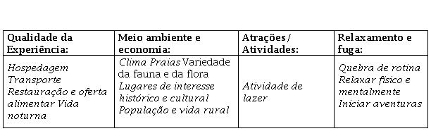 Inspirando-se nas categorias apontadas no Quadro 2, buscou-se selecionar cenários, atrativos, serviços, equipamentos e motivações criadoras do imaginário sobre os destinos RN. Destacam-se na categoria de análise qualidade da experiência as seguintes categorias de registro: