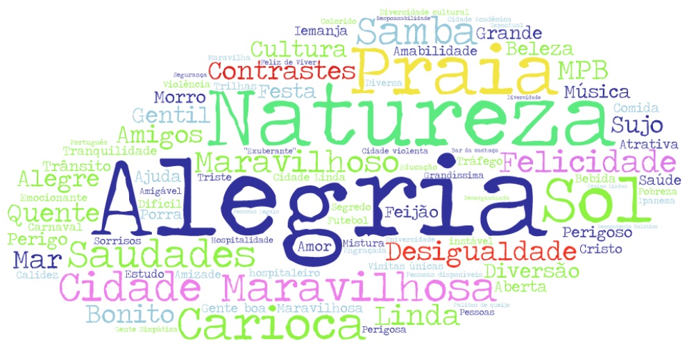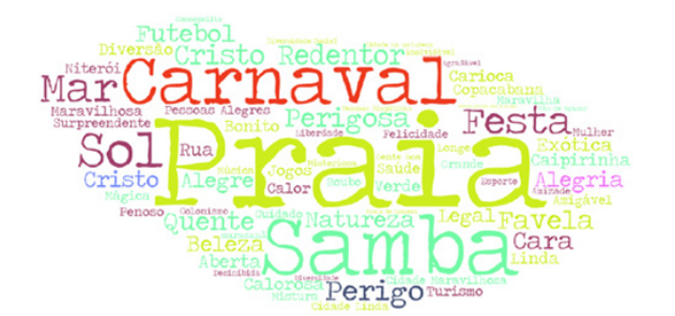 Com relação à imagem dos intercambistas antes de virem ao Rio de Janeiro, predominaram alguns estereótipos da cidade. Bignami (2002, p. 12) afirma que “... a imagem, nesse caso, é aquela que coincide com a maioria das representações a mente dos indivíduos”. Questionou-se sobre a percepção do destino antes de viajar, solicitando ao respondente do questionário três palavras em que ele relacionava com o Rio de Janeiro. Com o intuito de identificar as palavras mais citadas, utilizou-se o recurso gráfico nuvem de palavras por meio do site Tagul - Word CloudArt para a elaboração da Figura 1.